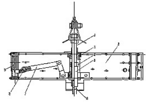 小型礦井防墜器可滿足空、重提升負荷變化大的要求。防墜器的箱式結構如圖1所示,包括一個鋼板一次成型的主體2與捕繩裝置9構成的箱式結構整體,箱體裝置有主提升桿1、變節距彈簧儲能裝置3、平衡軸5、調節螺母5、懸掛桿6、杠桿組7及支撐于本體上的杠桿軸8。